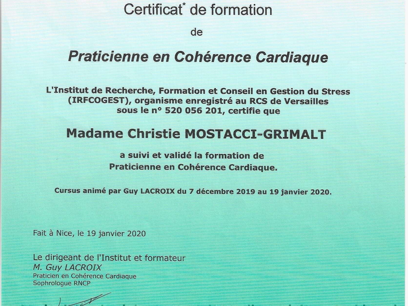 Titulaire du Certificat Professionnel de Sophrologue, enregistré au Répertoire National de la Certification Professionnelle (Qualification reconnue par l'Etat).